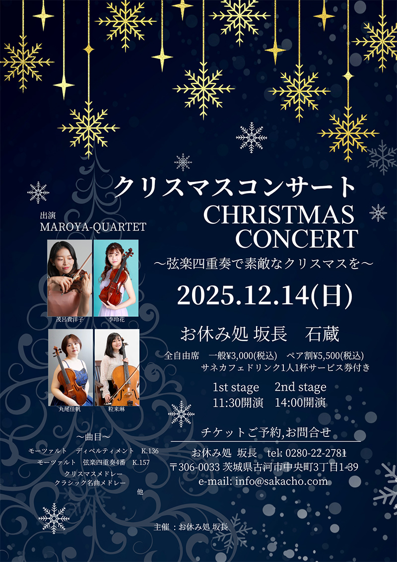 プロの弦楽四重奏団が本場のクラシックから、親しみやすい映画音楽,クリスマスメドレーまで様々な曲を演奏いたします!